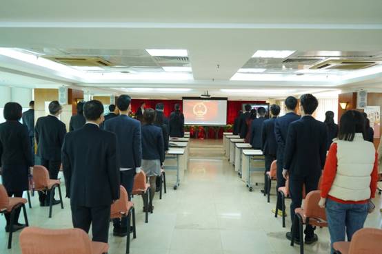 公司升国旗仪式现场,全体参会员工起立奏唱国歌