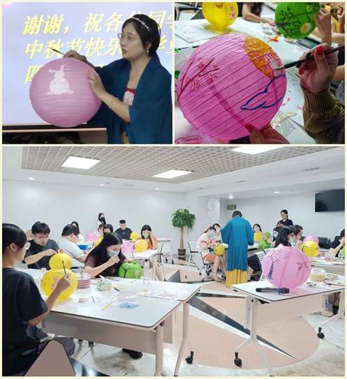 在中华传统文化概念中,灯笼的寓意是幸福团圆。为营造喜庆的氛围,庆祝中秋佳节的来临,本次团日活动也特别邀请到了毕业于广州美术学院,具有丰富传统绘画实践教学经验,长期致力推广汉服汉礼等传统文化的钟凤芬老师教授灯笼绘画技巧。钟老师首先向大家简要介绍了中秋节的来历以及广府地区庆祝中秋节的习俗。随后,在钟老师的示范带领下,大家纷纷开始进行绘画创作,可爱呆萌的玉兔、高大挺拔的桂树、清幽淡雅的兰花……美好的画面一一呈现在灯笼上。