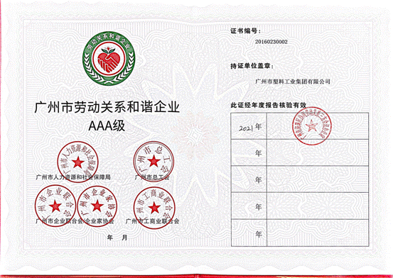 在2021年广州市“劳动关系和谐企业AAA级”评选活动中,塑料公司荣膺2021年度广州市“劳动关系和谐企业AAA级”称号。自2016年开始,塑料公司已经连续六年获此殊荣。