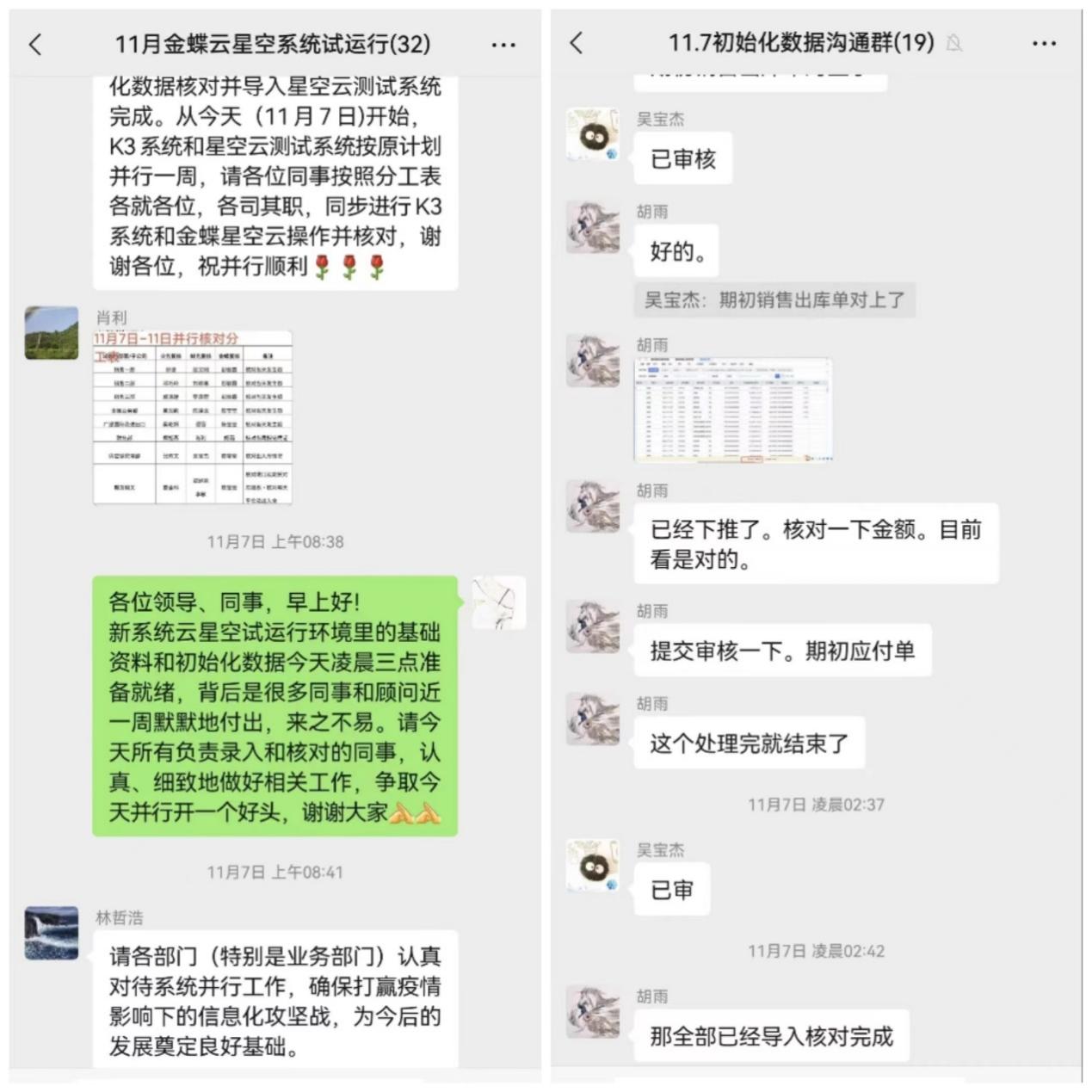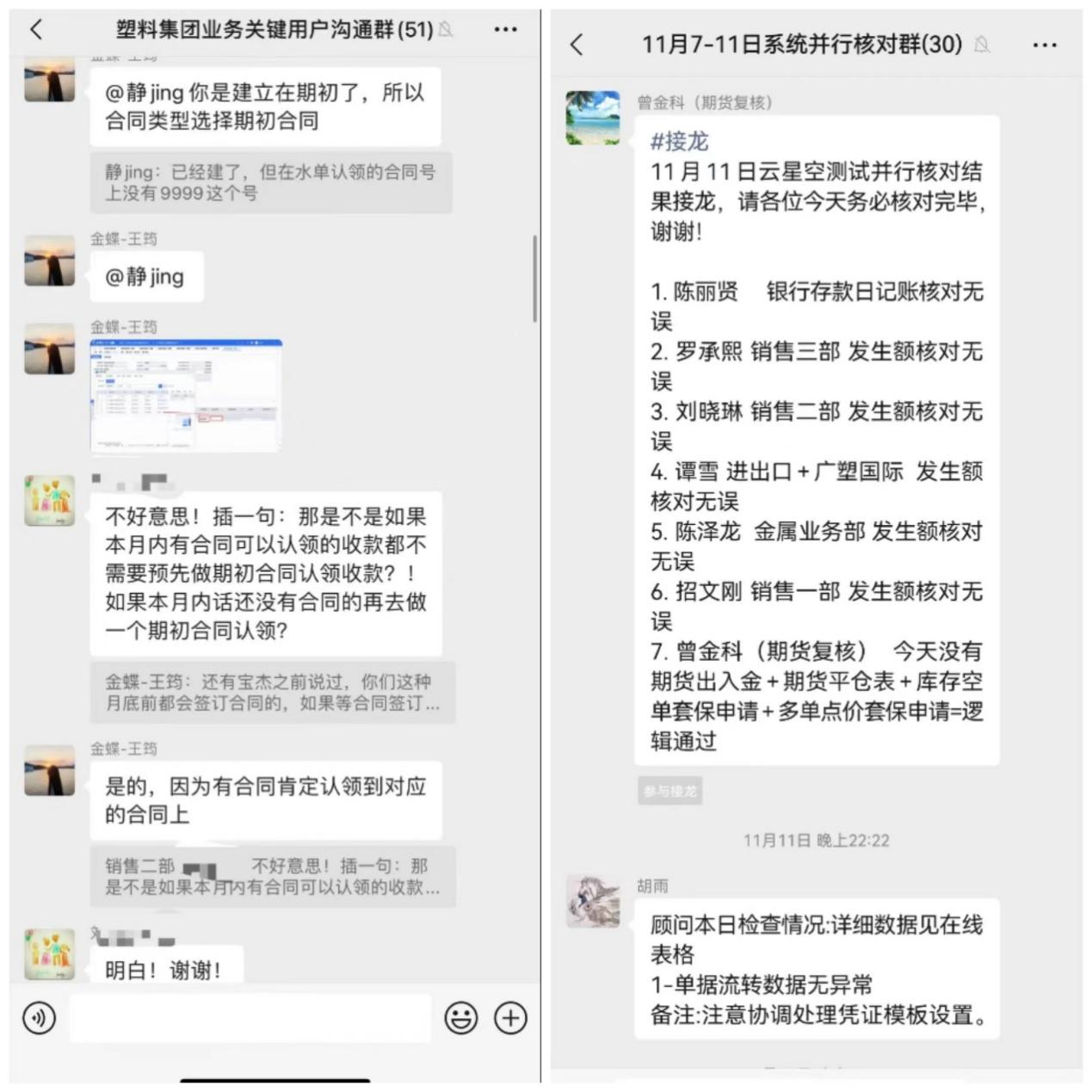 (二)协同联动,紧密配合。为保障金蝶“云星空”系统每日顺利并行,并为后期公司全面应用系统打下坚实的基础,在完成银行结算系统工作后,塑料公司各部门协同联动,紧密配合,每天晚上7点线上召开工作总结会议并分析探讨存在问题及解决方案,进一步坚定了各部门团结一致、奋勇争先做好系统试运行的决心和信心。