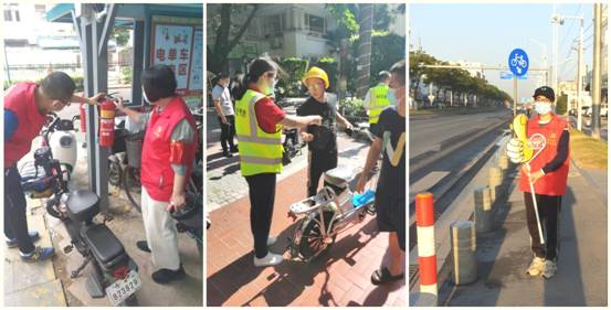 广纺检测党支部书记杨梅、塑料公司孙楠、利工民邱舒婷参与电动车充电点安全检查、电动车上牌宣传、文明交通指引志愿服务