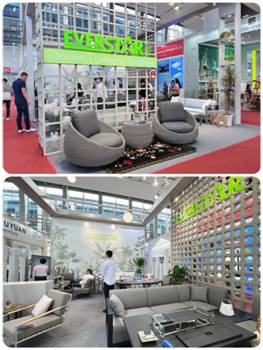 家具展位以低碳环保、节能减排为设计理念,浅色系框架为主体,搭配绿植风格的背景展示户外家具产品,户外美学的氛围感瞬间拉满。