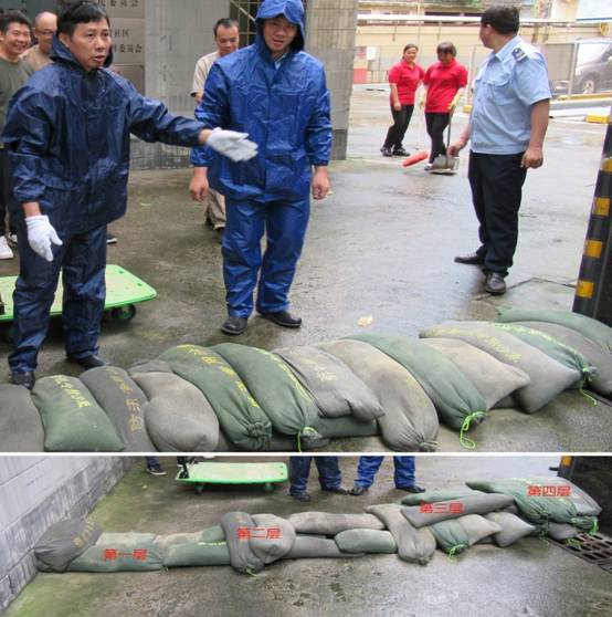演练设想突发暴雨灾害导致广德大厦停车场地下车库水位迅速升高,车场入口雨水倒灌,危及车辆和升降设备安全,要迅速防洪排洪解除危险。在应急指挥中心下达指令后,各演练分组迅速到位,立即启动车场地下车库排水泵,抢险人员穿上水鞋和雨衣,用推车搬运沙袋到车库入口堆放,阻挡对面马路的雨水倒灌入车场,雨水过后清洁人员清理现场淤泥,恢复生产。