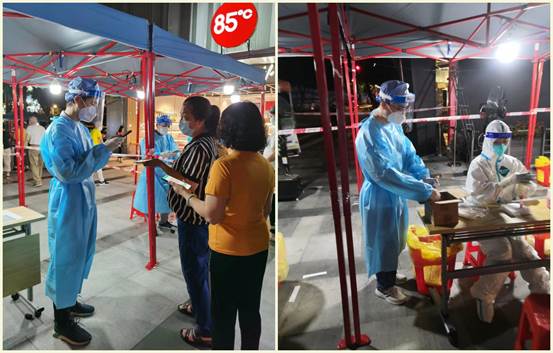 由于陈炯龙、陈英东两位此前都有过负责核酸检测扫码工作的经验,在志愿服务岗前培训会议上,他们主动提出要承接这项亟需专注力和耐心的工作。陈炯龙为老人家仔细核对姓名、身份证号,耐心解释工作流程,获得老人一致好评。当医护组上缺少志愿者时,陈英东又化身为核酸检测样管“护送人”,认真核对核酸样管数量及检测人数,及时准确地报送给医护组……他们像陀螺一样从晚上8点开始连轴转忙碌到半夜12点多才结束任务回家。